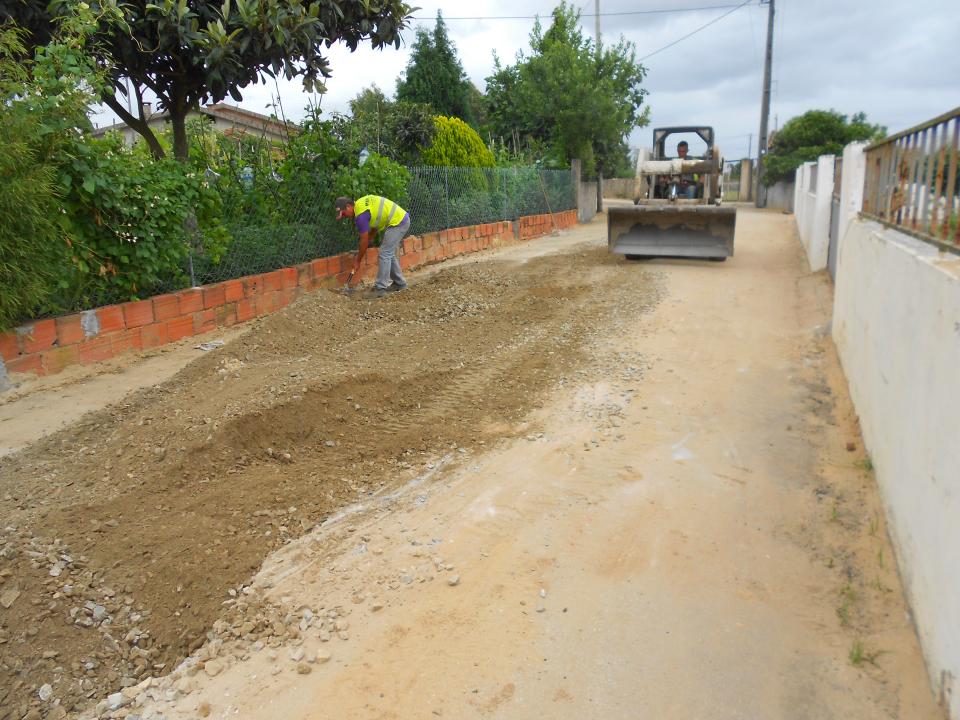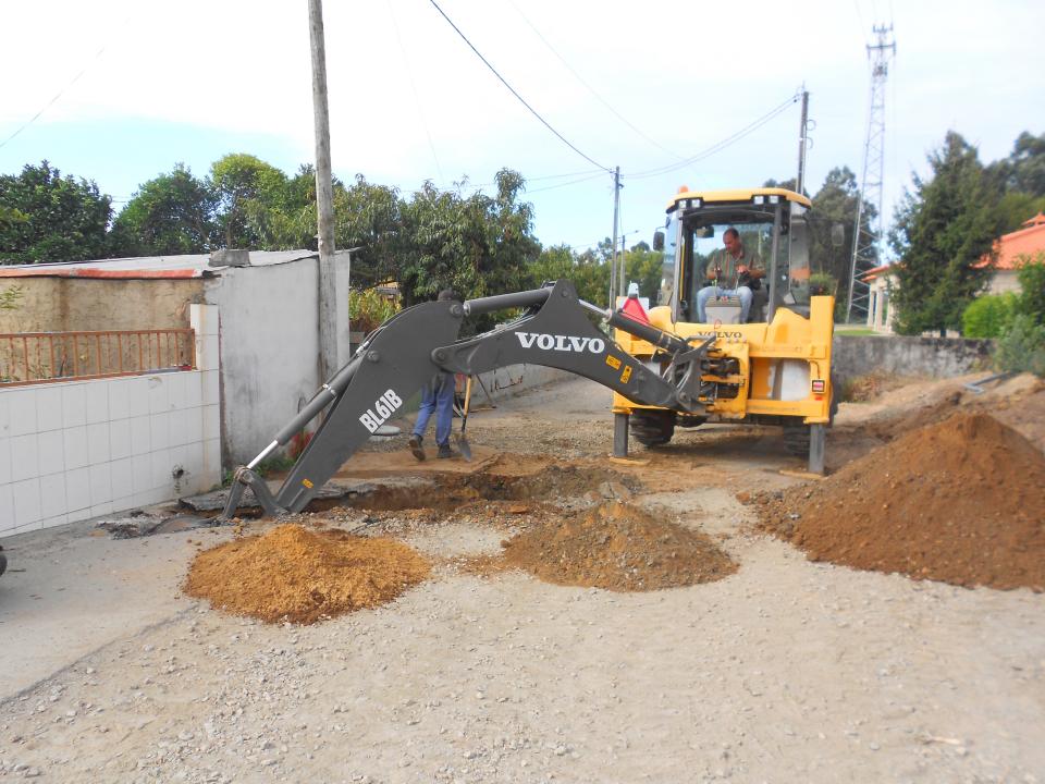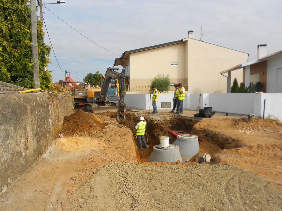 Instalação de conduta e execução de caixas, sumidouros, sarjetas e ramais domiciliários. As caixas de visita são em elementos pré-fabricados de betão e as tubagens em PP corrugado.