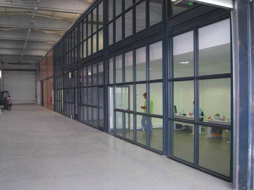Armazém: Construção civil completa das obras de adaptação de espaço construído de um armazém existente incluindo edificação de dois corpos autónomos interiores, obras de infraestruturas e ainda vedação e pavimentação de área exterior anexa.